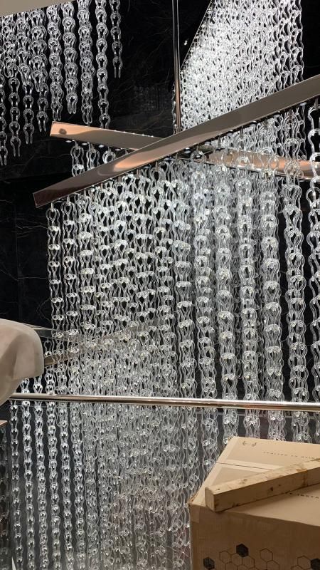 Место над фонтаном, внутри особняка, было выбрано неслучайно - ниспадающие нити стекла повторяют течение водопада по стене, завершающегося фонтаном с изящной статуей. Направляя взгляд вверх посетитель видит бесконечное движение стекла, воды, блеск нержавеющей стали в основании подчеркивает водную эстетику. Освещение люстры продумано таким образом, что свет, направленный вниз заставляет играть переливами стеклянные подвесы на всем протяжении.