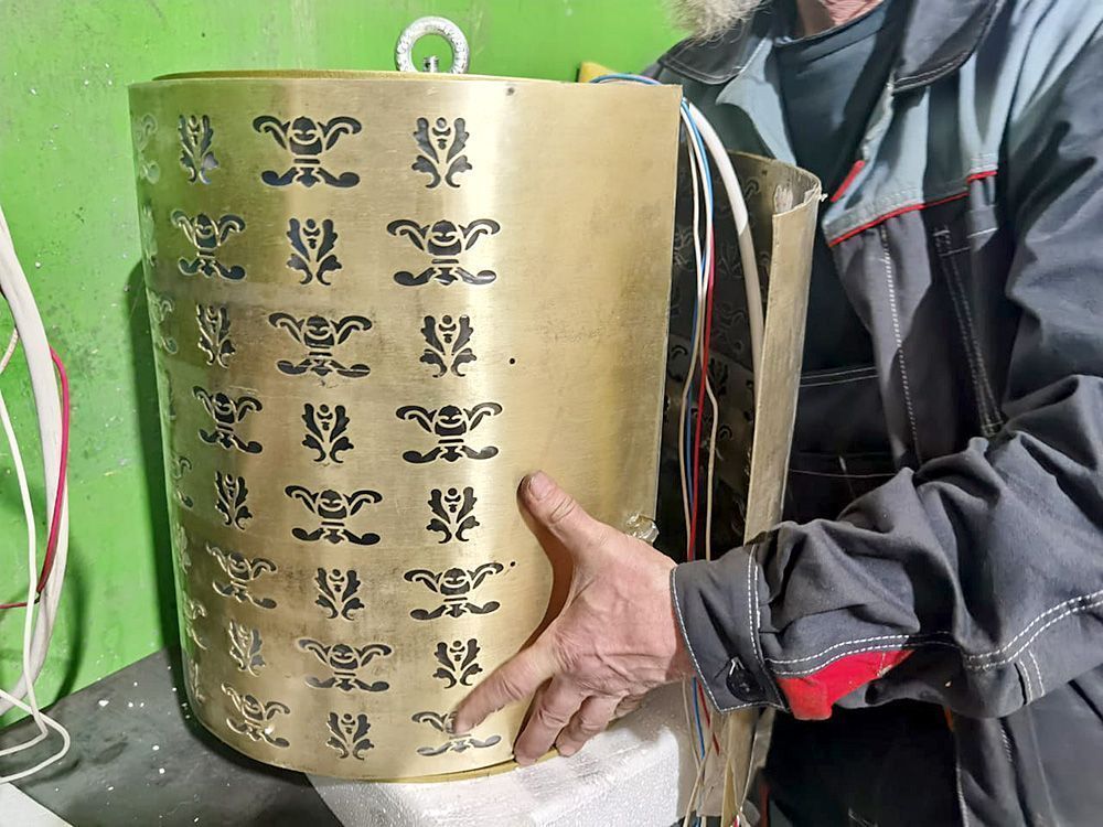 В силу архитектурных особенностей подъемное оборудование для паникадила не всегда можно спрятать в межпотолочном пространстве. Стояла задача "вписать"  подъемник в интерьер храма и визуально объединит с люстрой. Было принято решение изготовить декоративную обечайку из благородной латуни и с узором, повторяющим элементы люстры. Финишное покрытие - сатинирование. Так сочетание эстетики и технических решений гармонично соединились церковными канонами.